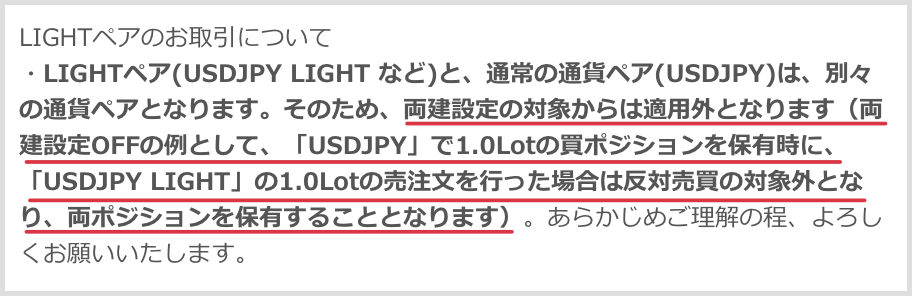 ここでは両建て設定OFFの場合でも反対売買にならず買いポジと売りポジを保有できると言っています。別のペアという扱いなので両建てという扱いにはならない模様。