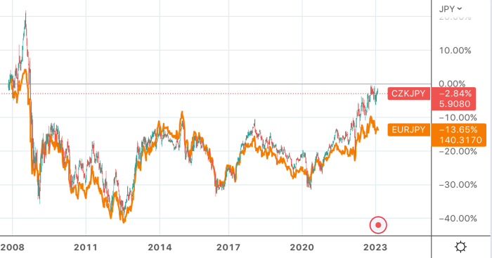 チェココルナ円はユーロ円のチャートと非常に連動しています。